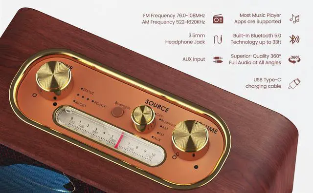 Authentic Vintage Aesthetic Meets Modern Connectivity: Experience genuine retro charm with today's technology. This wooden FM/AM radio features a real wood frame, classic rotary tuning dial with ambient lighting, and tactile metal knobs - consistently praised by customers for its "solid, premium feel. " Combines Bluetooth 5.4 streaming, traditional radio, and AUX input in one versatile device that bridges classic and modern audio needs. ^^ Your Home