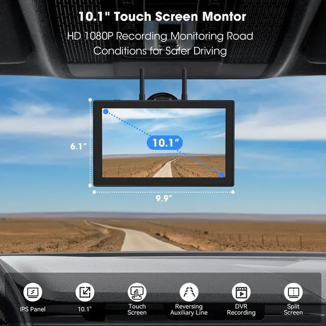 Tip: It is not suitable for metals such as fiberglass or aluminum that cannot be magnetically attracted. ^^ True 15000mAh Long Battery LifeThe portable wireless back up camera has a built-in true 15000mAh rechargeable battery, provides up to 28 hours of use per full charge. And also comes with a 5W solar panel and a 5V/3A Type-C charger, both of which provide the backup camera wireless with longer battery life when the battery is low or the sun is low. ^^ 10.1"T ouch ScreenTruck backup cameras with high resolution can provide super clear and real color image. 10 inch large screen offers a bigger view, making it easier to see obstacles, pedestrians, or other vehicles behind you. Touch screen helps you to set up the monitor and playback recorded videos more easily. ^^ Upgraded Wireless Backup CameraThe back up camera systems for truck built-in more powerful digital signal receiver and frequency hopping technology, greatly reducing the possibilities of frame drop and signal delay. The signal transmission distance of the magnetic wireless backup camera is up to 36ft. ^^ Low-power Solar Backup CameraThe upgraded magnetic backup camera now syncs automatically with the monitor.