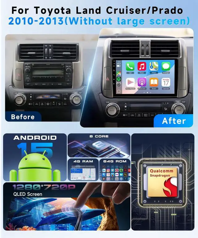 Plug-and-Play Design & Steering Wheel Control-- Tailored specifically for Toyota Land Cruiser/Prado 2010 2011 2012 2013 models, this car stereo features a plug-and-play design that requires no extra modifications. This Toyota Land Cruiser car radio fully supports steering wheel control, allowing you to adjust volume, change tracks, and answer calls without taking your hands off the wheelperfect for safe driving on US roads with your Toyota Land Cruiser stereo. ^^ 1280P QLED Touchscreen & Android 15 OS-- Boast a 9-inch high-definition IPS touchscreen with 1280*720 resolution for your car radio, offering an ultra-wide viewing angle, accurate colors, and crisp detailseven in bright sunlight.