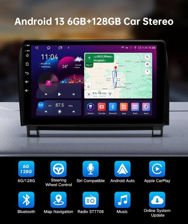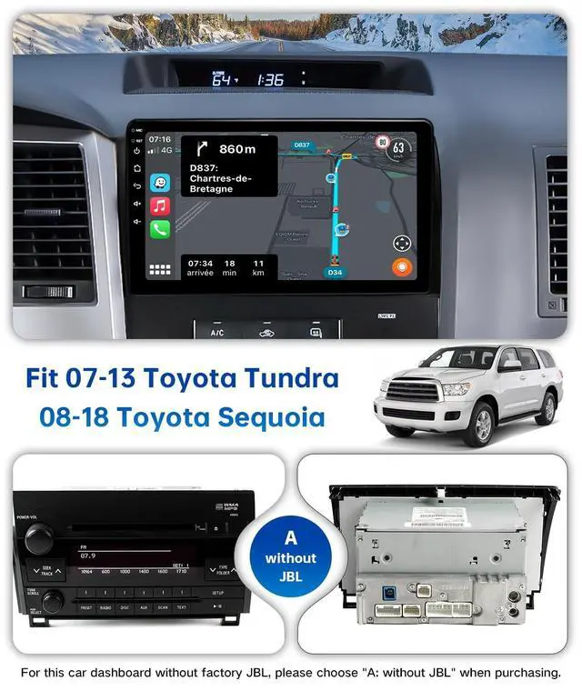 Note: If the wiring harness is not compatible with your car, please contact us to replace the correct wiring harness instead of returning the head unit. 2014-2019 Toyota Sequoia, please purchase the CAN004-X harness (B0BZ7YZDCV) ^^ Toyota Tundra Car Stereo RadioThis Plug and Play radio is compatible with 2007-2013 Toyota Tundra and 2008-2013 Toyota Sequoia. Equipped with wiring harness XC004, Suitable for cars without JBL amplifier and without reversing camera. ^^ Super hardware and software The car radio with apple carplay comes with 128GB of internal storage and 6GB of RAM. Featuring Android 13, The built-in UIS7862 Octa-core processor, which includes 2 Cortex-A75 and 6 Cortex-A55 cores running at 1.8GH z, ensures high performance and low power consumption. ^^ Built-in Carplay & Android AutoThe ViaBecs head unit comes equipped with built-in Carplay and Android Auto functionality. Enjoy wireless Carplay without the need for a USB cable. Use Siri or Google Assistant to make calls, play music, send messages, and get directions while focusing on driving. Additionally, Android Auto features can be accessed via a connected USB cable, allowing you to use apps like Maps, Music, and Calls from your mobile device.