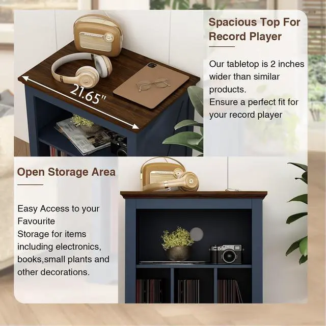 ^^ Ample Storage: The spacious top is 2 inches wider than similar products, which is easily accommodates various sizes of record players, meeting the needs of most vinyl enthusiasts. Whether its for a snacks, decorative items or extra audio equipment, the spacious second shelf of this record holder is ready for daily use. Perfect for those moments when you need a bit more space. Plus, this record player stand with vinyl storage can also serve as a small table stand or printer stand, making it a versatile addition to any room.