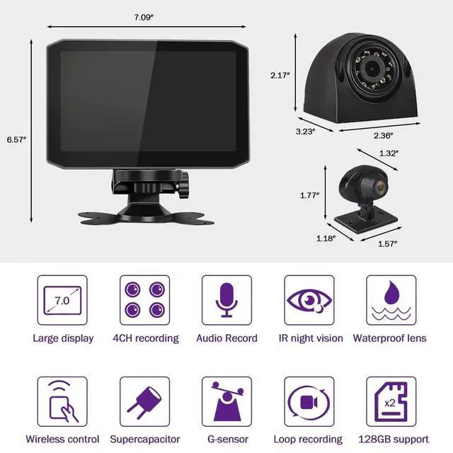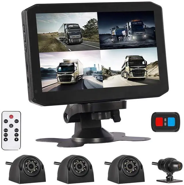Recording: The X7 Truck dashboard camera recording system is equipped with four-channel simultaneous video and audio recording cameras. Easily position them to monitor the front, left, right, and rear side of your vehicle to ensure safe driving from all angles. With a voltage range from 9-30V DC power, it accommodates a wide variety of vehicles such as semi-trucks, vans, pickups, caravans, harvesters, tractors, and wreckers. ^^ 7.0 '' HD Display with