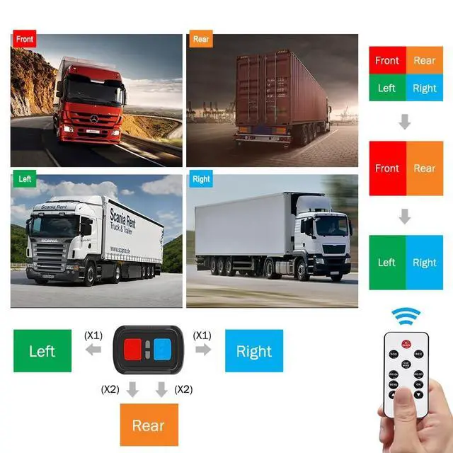 Quad Split Screen: VSYSTO X7 boasts a 7.0" HD (800x480) Widescreen LCD with integrated DVR. The 360 four-way dashcam supports single full view and 2/4 split screen display modes, providing extensive monitoring options. Simply connect the camera's yellow wire to your vehicle's turn/reverse trigger wire for automatic display switching when turning or reversing. For added convenience, the included 2.4G or IR wireless remote enables easy manual switching for full control. ^^ IR Night Vision &
