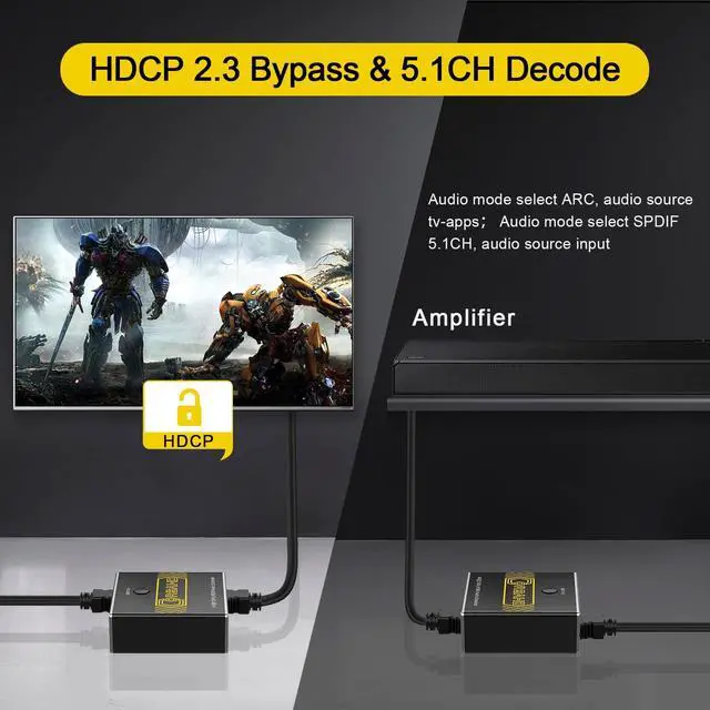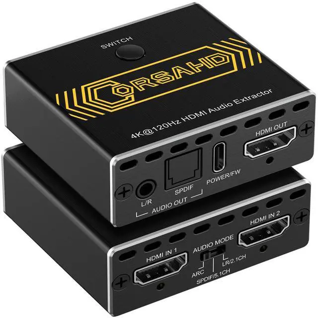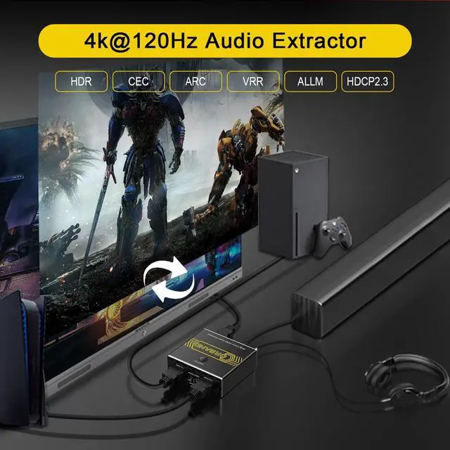 4K@120Hz HDMI 2.1 Audio Extractor -- The 2 ports HDMI 2.1 Audio Extractor easily extract audio from your HDMI sources to 1 HDMI Display device and 1 Optical Toslink SPDIF 5.1C h audio device or 1 AUX L/R 2.1C h audio device. Also can easily switch between 2 HDMI souces by pressing single button. It supports CEC and ARC. Also supports VRR and ALLM for better game experience. ^^ Video & Audio Format -- Video Format - HDMI 2.1 Audio Extractor supports multiple resolution up to 8K@60Hz 4K@120Hz 5120x1440@120Hz 1080P@240Hz 4:4: 4 8bit. Also supports VRR, ALLM, HDR 10, Dolby vision, 3D effect, HDCP 2.2, HDCP 2.3 bypass. Audio Format - Supports Optical Toslink SPDIF 5.1C h, AUX L/R 3.5 mm 2.1C h, ARC, Dolby Atmos, DTS X, Dolby True HD, DTS-HD Master Audio. ^^ Easy Usage -- Plug and play. Power on with adapter. Simply connect HDMI sources to Input ports and HDMI display device to Output port through HDMI 2.1 cable. Then connect audio device through Optical Toslink SPDIF 5.1C h port or AUX L/R 3.5 mm 2.1C h port. The led light will indicate which port is working. Easily switch between 2 HDMI sources by pressing the panel button. Supports CEC when audio mode is set to "SPDIF". Supports ARC shen audio mode is set to "ARC". ^^ Wide Compatibility -- 2 ports HDMI Switcher Selector Audio Extractor is highly compatible with all operating system such as Windows, Mac OS, Linux. Also works perfectly with Logitech Harmony, Xbox one X, PS4 Pro, 4K, Roku 4, Fire TV, Blu-ray players, Projector, NVIDIA and AMD graphics cards, etc.