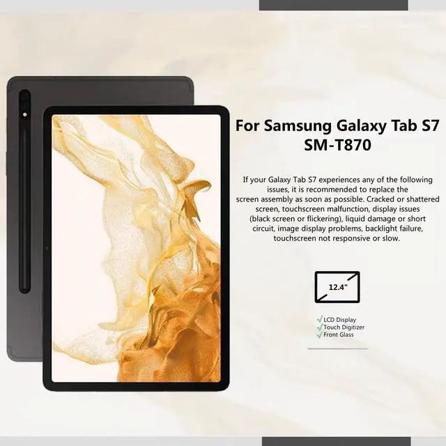 ^^ [APPLICATION]]: If your Galaxy Tab S7 experiences any of the following issues, it is recommended to replace the screen assembly as soon as possible. Cracked or shattered screen, touchscreen malfunction, display issues (black screen or flickering), liquid damage or short circuit, image display problems, backlight failure, touchscreen not responsive or slow.
