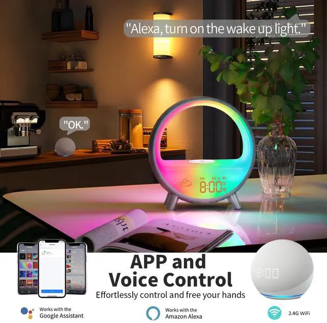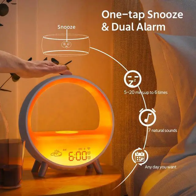 Smart App & Voice Control: The alarm clock is compatible with Alexa, Google Assistant via voice control, or the Smart Life app (requires 2.4GH z WiFi). Set dual alarms, adjust volume across 10 levels, choose from 11 lighting effects, and customize snooze duration via APP control. ^^