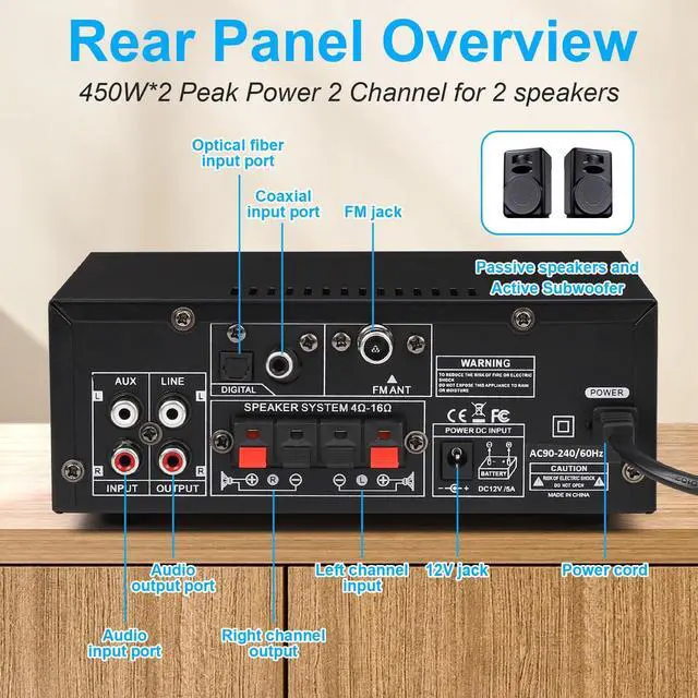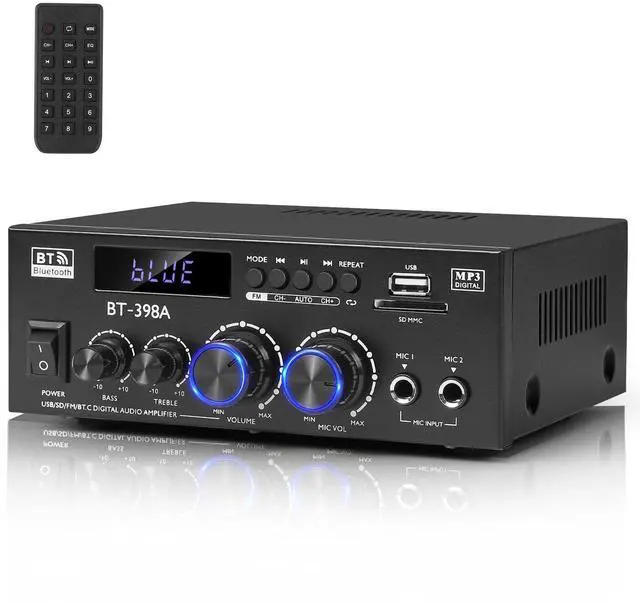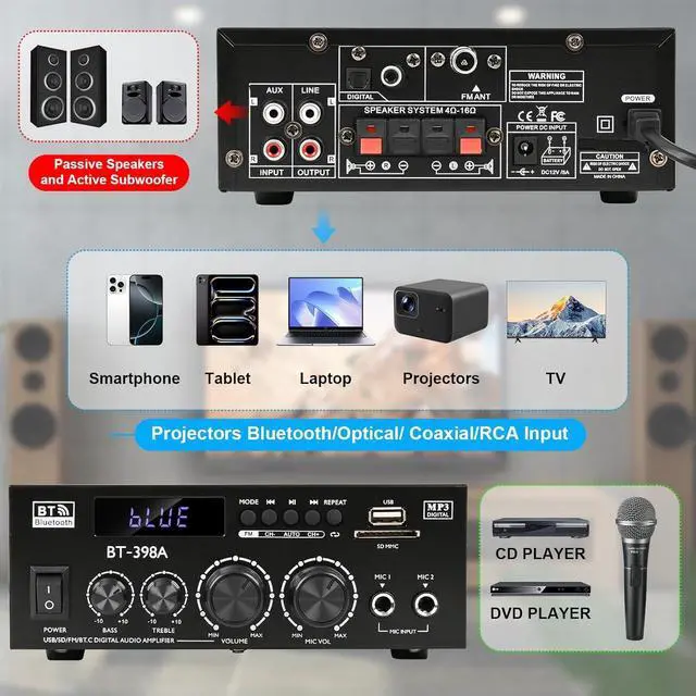 450W Powerful Output The Romicta BT-398A Digital Audio Amplifier (Upgraded version of AK45 amplifier) features a fully upgraded design with 450W+450W peak power and 60W+60W rated power, It introduces an innovative feature, supporting not only 4-16 inch passive speakers but also active subwoofers. Perfect for home karaoke, home theaters, and HiFi sound systems, it is ideal for small apartments, bedrooms, offices, basements, and garages. Its compact design fits effortlessly into bookshelves or A/V cabinets. ^^ Bluetooth 5.0 Stable Connection Equipped with a Bluetooth 5.0 core, it ensures no popping sounds or noticeable noise, specifically designed for HiFi sound lovers.