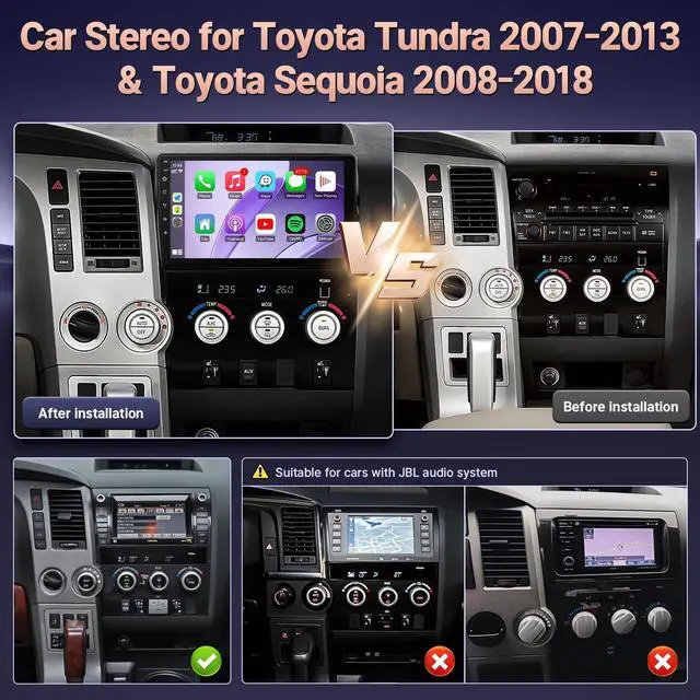 Note: If the harness is not fit for your car, please contact us to replace the correct wiring harness ^^ Applicable Car ModelsOur KuTaiTai original factory style car radio stereo is perfectly suitable for Toyota Tundra 2007 2008 2009 2010 2011 2012 2013 Toyota Sequoia 2008 2009 2010 2011 2012 2013 2014 2015 2016 2017 2018. Please check the car model, year, dimensions and shape of the center console of your vehicles before purchasing. If you are not sure, you can send messages or picture to us, we will give you advice ^^ Wireless CarPlay & Android Auto & MirrorlinkThis car stereo for 2008 Toyota Tundra supports iOS CarPlay, Android Auto and Mirror Link, enabling safe and convenient access to apps, navigation, music, and calls on the dashboard. With intuitive controls and driver-friendly interfaces, it enhances your driving experience while minimizing distractions. Compatible with leading apps and devices, MirrorLink delivers a smarter, connected ride. Upgrade your drive today! ^^ Plug and Play Car Audio ReceiversThe car stereo for 2009 Toyota Sequoia equipped with a 10.1 inch 1280*720 IPS Touchscreen, 4-Core processor, 2G RAM+32G ROM, offline/online GPS navigation, WiFi connection, FM radio, with waterproof HD rear view camera, support Android/IOS smartphone mirror link, steering wheel control, split screen, 2 USB, EQ adjustable, 24 UI and wallpaper choose.