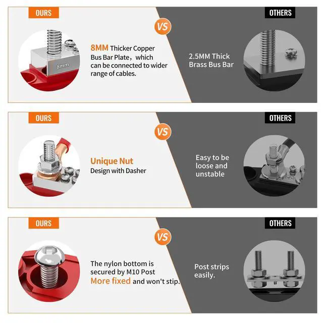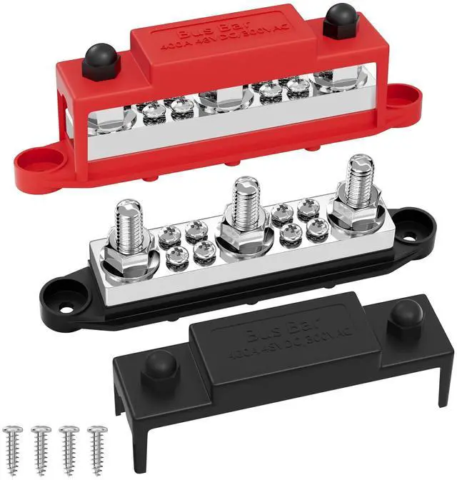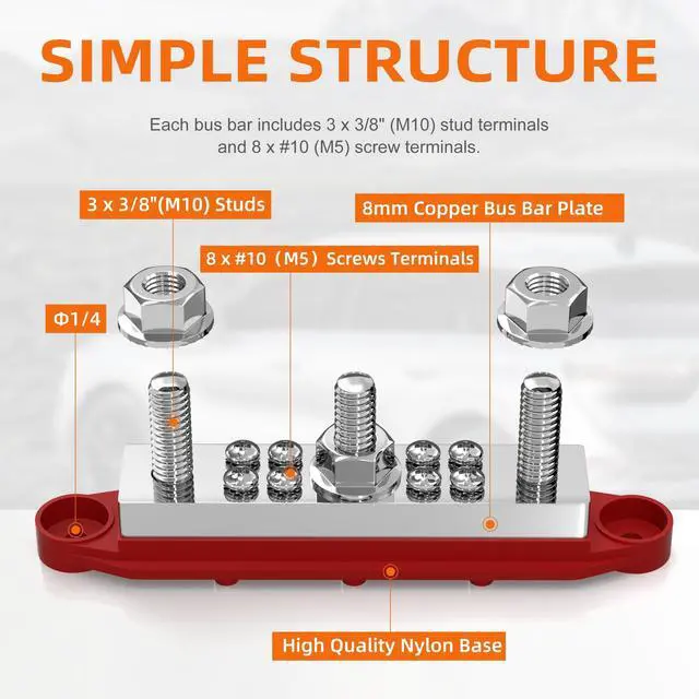 Superior Material: The 400A bus bar terminal block 12v features 8mm( 0.32" ) thicker COPPER bus bar plate with stainless steel studs and nuts. Red Positive Busbar and Black Negative (Ground) Busbar as a pair ^^ Ease of