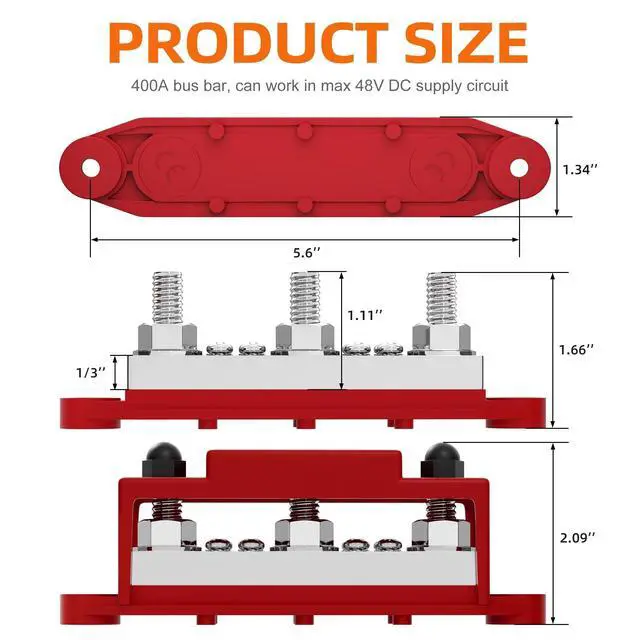 Heavy Duty: The bus bar rated 400A when work in 12v supplier circuit, and the power distribution block can work with MAX 48V DC & 300V AC source power ^^ 3/8"