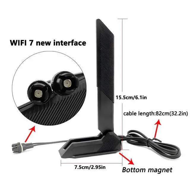Folding Design: The magnetic base adheres to metal surfaces, while the 180-degree folding design reduces the length to 82 cm when folded. It fits easily into a laptop bag, offering exceptional portability for home, office, and industrial use. ^^ Supports for ASUS ROG Gaming routers, for Gigabyte routers, and PCIe WiFi cards, while also compatible with 2.4GH z, 5GHz, and 6GHz WiFi 7 routers and motherboards. ^^ Supports Bluetooth, compatible with various PCI-E wireless network cards, tri-band extension antenna, magnetic attachment.