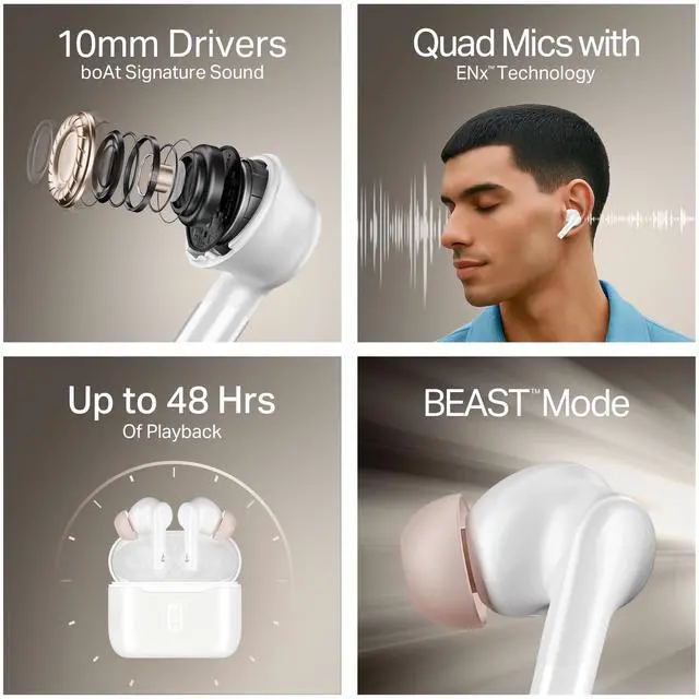 Experience superior wireless audio with the boAt Airdopes 141 Gen 2, featuring cutting-edge ENx Technology with 4 microphones for crystal-clear calls. These TWS earbuds deliver an impressive 48 hours of total playback time, perfect for extended listening sessions. The fast charging capability ensures you spend less time waiting and more time enjoying your music. With low latency mode, you can enjoy seamless gaming and video watching without any audio lag. The IPX4 water resistance rating protects against splashes and sweat, making these earbuds ideal for workouts. Powered by Bluetooth v 5.4, these wireless earphones provide stable connectivity and enhanced range.