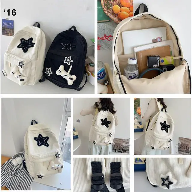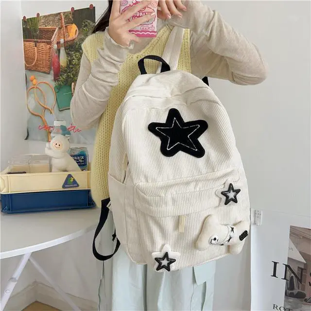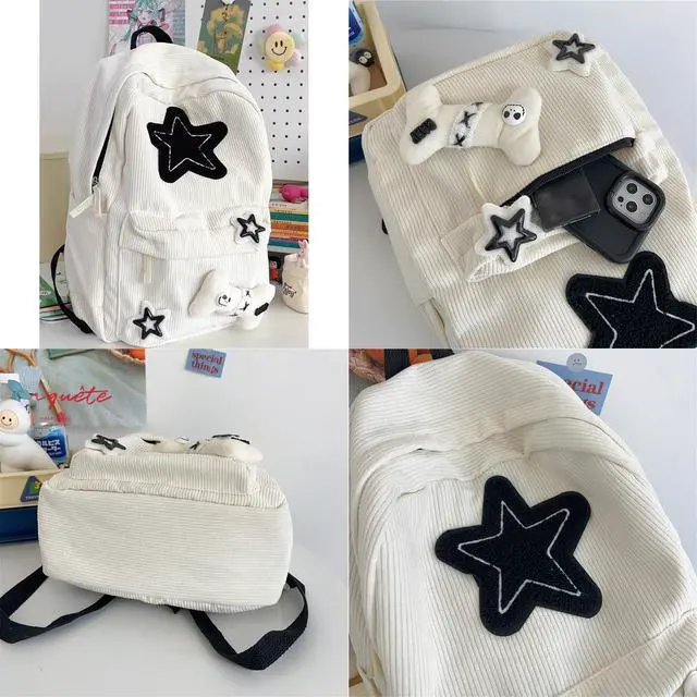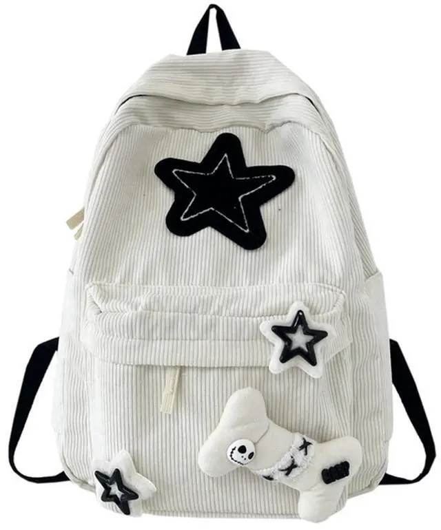 Design: Quality Corduroy with star patterns and bone doll makes a adorable bag.Thoughtfully designed compartments in the backpack.There is also a zipper on the back for convenient storage of mobile phones or other personal items