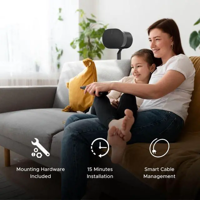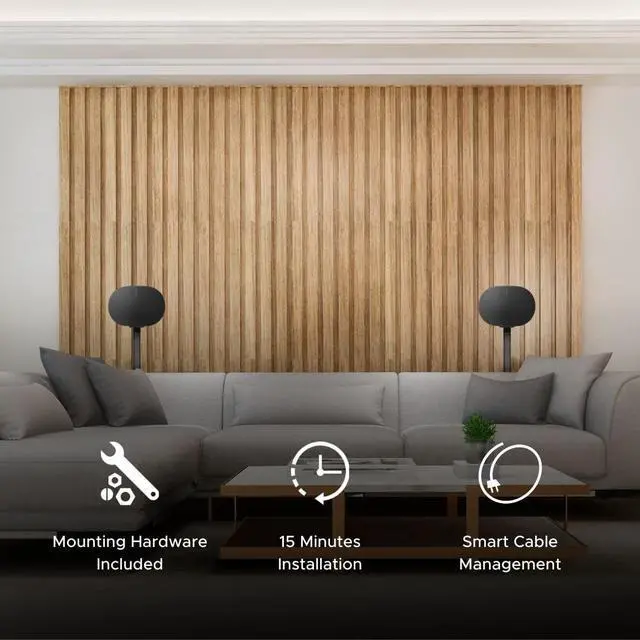 ENGINEERED FOR ACOUSTIC PERFECTION: Our floor stand raises the Sonos ERA300 to the acoustically optimal height of one meter (40 inches). It's expertly designed to situate the speaker above the sofa back, aligning the audio output with your ears for an enveloping sound experience. Enjoy superior audio performance in any seat, assured by our specialized design. ^^ SLEEK DESIGN, SUPERIOR