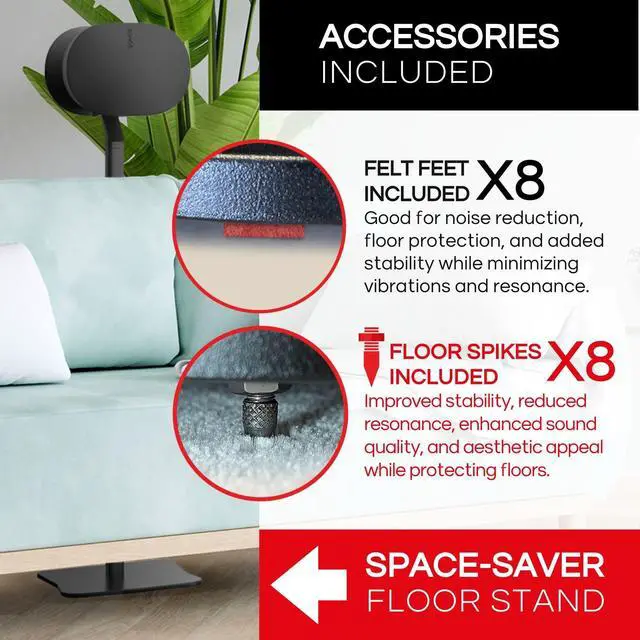 ^^ VERSATILE FLOOR COMPATIBILITY: Tailored to suit any flooring type, our stands for the Sonos ERA300 are equipped with both felt feet and adjustable steel spikes, ensuring stable placement whether on carpeted or hard floors. This adaptability enhances both stability and audio performance, offering flexibility in your audio setup choices. Included in this TWIN PACK are two floor stands along with the necessary hardware kits. Please note, the speakers are not included with the stands.