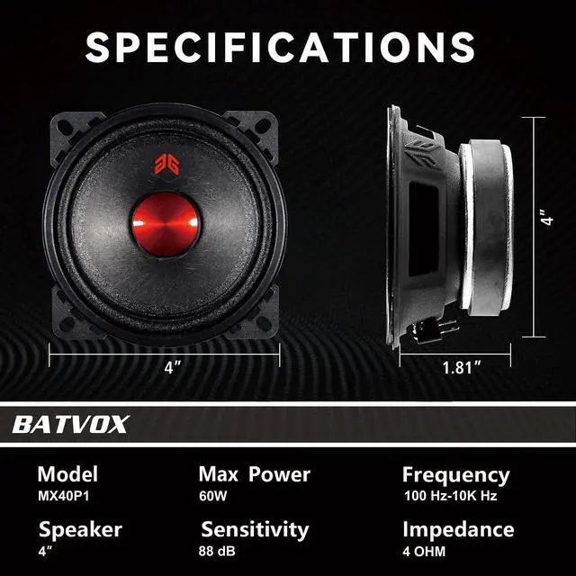 Upgrade your car or truck's audio system with these premium-quality 4" midrange door speakers. Designed for both performance and style, these speakers deliver unmatched power, clarity, and sound quality, transforming your vehicle into a high-performance audio haven. With their versatile compatibility and efficient power transfer, they're the perfect choice for music lovers seeking an immersive listening experience on every journey.