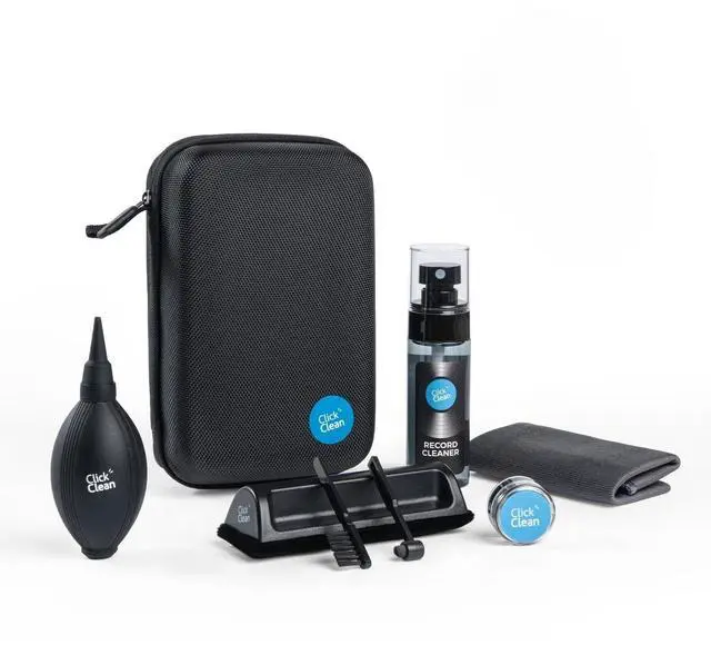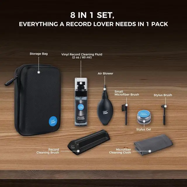 KIT: 1 * velvet cleaning brush, 1 * microfiber brush, 0.21 oz turntable needle cleaning gel, 2.1 oz cleaning solution, 1 *mini microfiber brush, 1 *air blower, and 1 *microfiber cleaning cloth. Tools needed from cleaning to preserving to restoring included. Comes with a small storage case, easy to store and carry. ^^