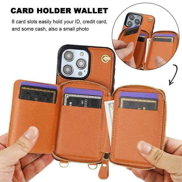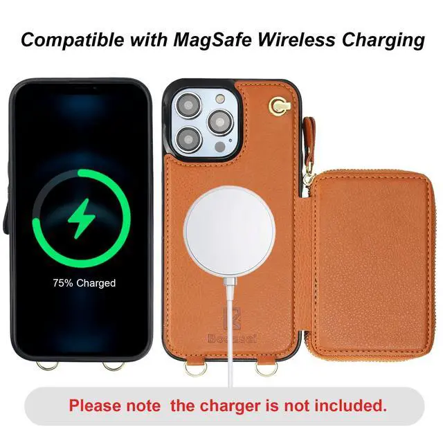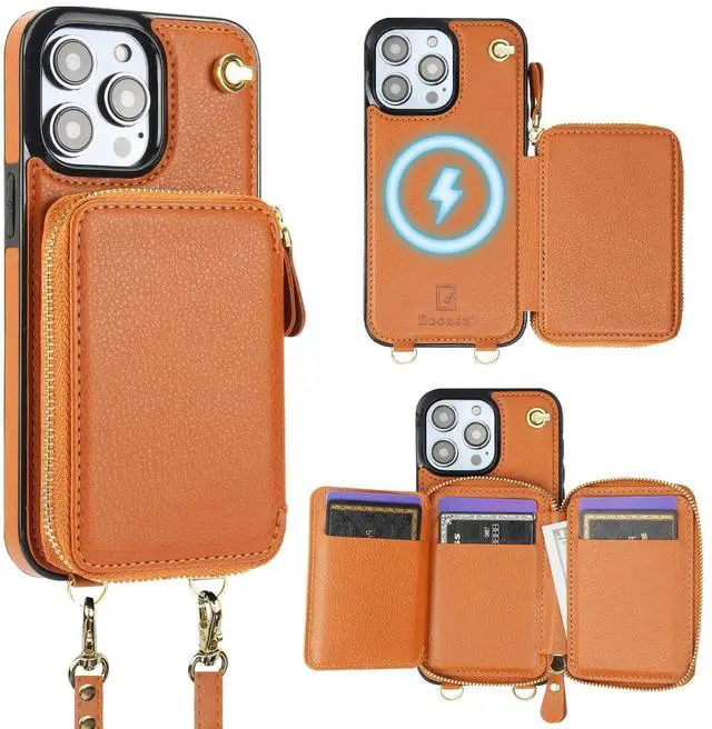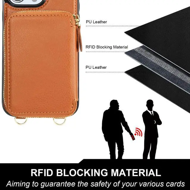 And the zipper closure can effectively keep your belongings inside. ^^ Convenient StrapsThere are 2 straps in this case with wallet for Mag Safe. An adjustable and detachable shoulder strap can make it to hang your phone on your neck horizontally or vertically as you like while a removable anti-lost wristlet allows you to hang your phone on your wrist. ^^ RFID Blocking MaterialThe RFID shielding material on our cross body protective case cover can effectively prevent the data in the chips of your cards from being read and copied through radio signals by RFID technology.