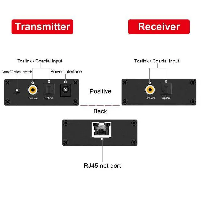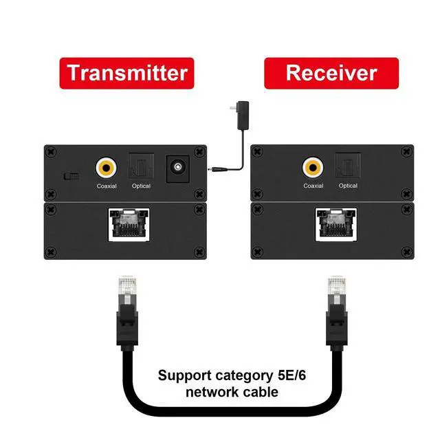 Digital Audio ExtenderSupports most standards to transmit one uncompressed lossless PCM audio or compressed 5.1 / 7.1 surround sound, such as Doby Digital Plus or DTS High Resolution Audio over one Cat5e/6 Cable S/PDIF and Toslink digital audio up to 500ft via cat5e/6. Transmitted over cat5e/6, so just only need to plug in Transmitter unit to be powered. Digital Audio Extender built in surge suppressor to protect audio equipment against damaging voltage spikes. Supports Doby Digital 5.1, DTS, and Doby TrueHD. Digital Audio Extender SpecificationData Transmission Rate 12.8 Mb/sSampling rateCoax (SPDIF) Optical (Toslink)
