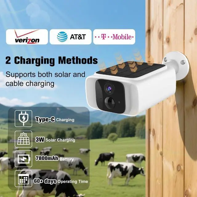 90 Days Free Unlimited Data & Low-Cost RenewalCellular security camera Built-in VSIM card offers 90 days free cellular data, It activates instantly upon setup and automatically connects to the strongest available network among AT&T, T-Mobile, and Verizon.