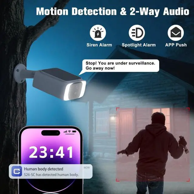 Plase note: The first 7 days are displayed as test traffic. Once used up, the system will automatically switch to your full 365-day free data plan without any interruption, After your first year, stay connected with our affordable plans($ 7.9 /30days-$ 79.9 /360, Protect your peace of mind for just $ 0.22 a dayour renewal plans make long-term security both affordable and hassle-free ^^ Truly Wireless & Forever Solar PoweredNo WiFi and no power outlets needed, off-grid freedom with our outdoor security camera, solar panel delivers non-stop energy to the massive 7800mAh battery, ensuring 365 days of uninterrupted operation, featuring energy-saving sleep mode, the camera activates instantly when motion is detected ^^ 2K HD Full-Color Night Vision & Two-Way AudioSee every detail, day or night. Capture sharp 2K footage that clearly shows faces and license plateseven in low lightWhen it's completely dark, infrared LEDs provide clear visibility up to 49ft. Talk and listen remotely using real-time two-way audio, Warn off intruders or greet visitors from anywhere ^^ AI Human Detection & Siren AlarmStop false alerts for good. Our advanced AI analyzes movement to detect people with over 95% accuracywhile filtering out animals, cars, and swaying branches.