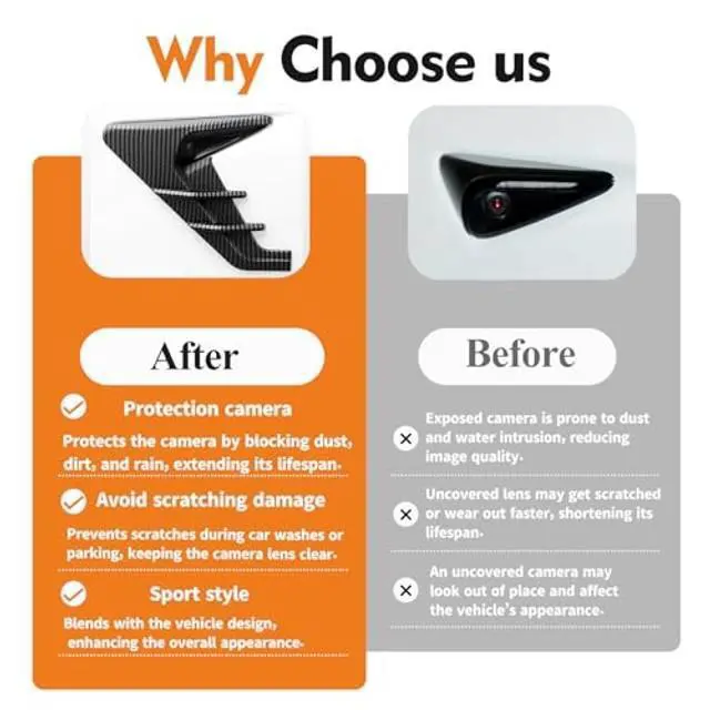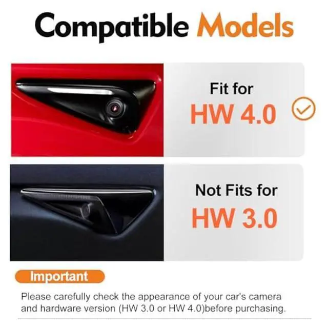 Applicable Vehicle ModelsThis Signal Side Camera Protection Cover Compatible with Model 3/Y 2024 2025, and is designed for Hardware 4.0 side cameras. Please confirm your vehicle's model, production year, and Hardware 4.0 version before purchasing. ^^ High-quality Ma rials This signal side camera protection cover is made of high-quality ABS material, which can effectively resist bending and cracking. It can withstand daily wear and tear, is not prone to fading, and is sturdy and durable! ^^ Easy to installNo drilling or disassembly required! Just use the provided double-sided tape to cover the signal of your car's side camera within a few minutes.