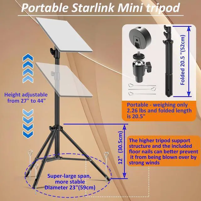 Shine: Engineered for the outdoors with corrosion-resistant aluminum and rugged nylon, this stable tripod ensures your Starlink Mini maintains a strong satellite connection through all weather conditions ^^
