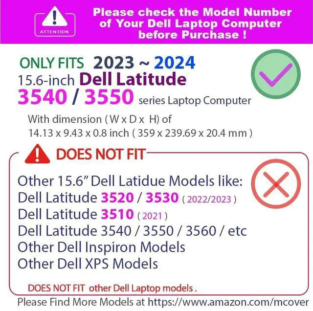 NOTE: Before placing order, PLEASE make sure to verify your laptop model number as this case is MODEL specific and NOT interchangeable. ^^ NOT fitting other 15-inch Dell Latitude laptops ( like Latitude 3510 / 3520 / 3530 ). NOT compatible with ANY other Dell laptops as well. ^^ Made of high-quality translucent polycarbonate material which is shatter-proof and will protect your 2023-2024 15.6" Dell Latitude 15 3540 / 3550 series Laptop Computer all around ^^ Designed to perfectly fit the 2023-2024 15.6" Dell Latitude 15 3540 / 3550 series Laptop Computer with dimension of 14.13 x 9.43 x 0.8 inch ( 359 x 239.69 x 20.4 mm ) ^^ 2-piece light-weight ( 12 oz or 340 g ) shell easily snaps on and off.