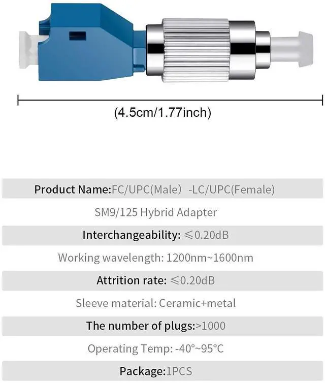 ^^ Widely Application: Compatible with Visual fault Locator (VFL). Apply to Telecommunications-CATV Engineering and Maintenance, Optic network Maintenance, Optical Measurement drive engineering, and other fiber-optic projects. ^^ The LC-FC (Male) Singlemode Fiber Adapter complies with IEC 61754-4, IEC 60784-14, and TIA 604-3 and conform to RoHS standards.