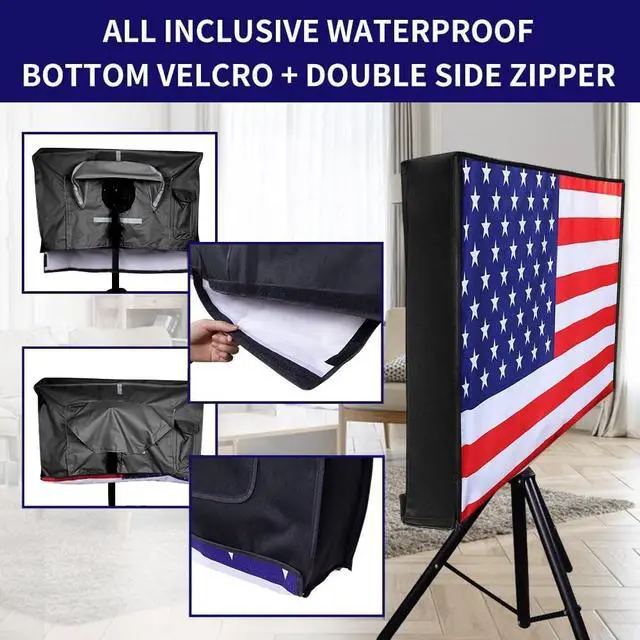 ^^ Complete WaterproofTo protect the TV from wet environments, the TV cover is equipped with waterproof zippers on both sides. The bottom and sides are closed and waterproof with Velcro. This design effectively blocks rain and water splashes, ensuring a dry environment for the TV without any damage. ^^ Not Affect Watching TVNo need to take the entire cover off when you watch TV. Just pull the zipper slightly, roll up the front cover, secure the rolled flap with the fixing strap. 2 transparent triangular films on the top to fix the cover on the TV, and the back pocket to store the remote control.