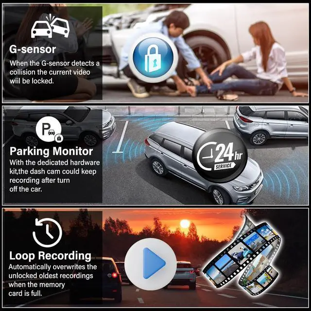 Loop Recording: When the G-SENSOR detects a collision, the G-Sensor will lock the accident video in an emergency, providing you with video evidence more adequate and deal with the accident more convenient. the front and rear mirror dash camera support loop recording, new video overwrites old video. Support TF card up to 128GB class 10 [The 64G SD card included] ^^ Motion Detection & 24H