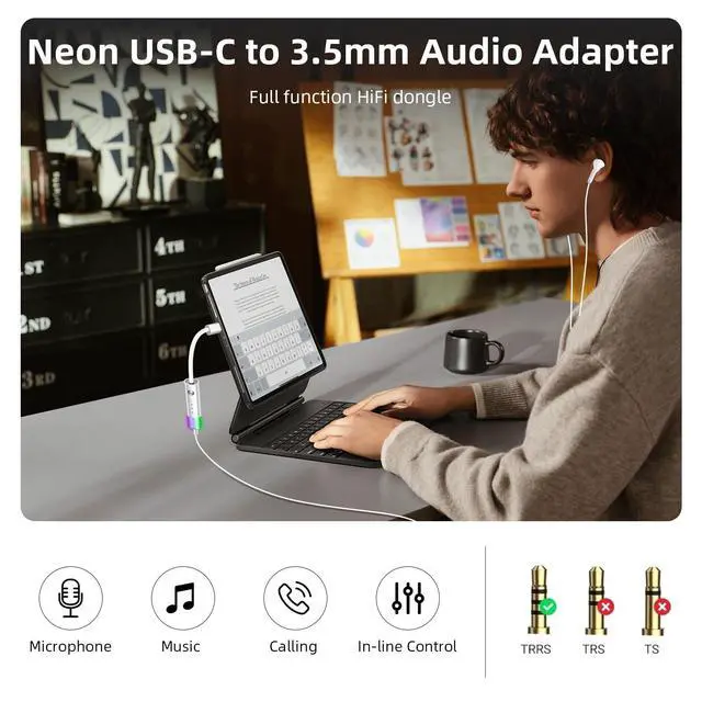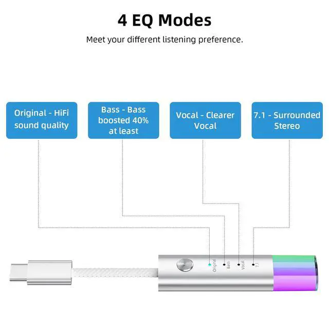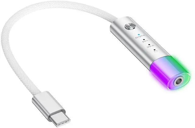 Universal USB-C to 3.5 mm Audio Adapter - Seamlessly connects your 3.5 mm wired headphones to USB-C devices (phones, tablets, laptops); No more compatibility issues with the latest tech; for iPhone 17 16 15(Pro Max/Pro/Plus/Air), for MacBook/iPad, for Samsung Galaxy S25 S24 S22 S21 S20 FE(Ultra/Edge), for Google Pixel 10 9 8 7 6 Pro and more usb c devices ^^ Triple EQ Sound Modes - Switch between Bass Boost (deep low frequencies), Crystal Clear Vocals (enhanced mid-range), and Surround Sound (immersive 3D audio) for customized listening ^^ Premium Durability - Features a nylon-braided cable (anti-tangle & kink-resistant) and aluminum alloy connectors for long-lasting wear and professional-grade signal transfer ^^ Neon Light Effect - The 3.5 mm headphone jack glows with vibrant LED lighting, adding a futuristic touch to your setup (great for gaming or night use) ^^ Plug-and-Play Convenience - No drivers needed! Works instantly with all USB-C devices and standard headphones, delivering high-fidelity audio on the go