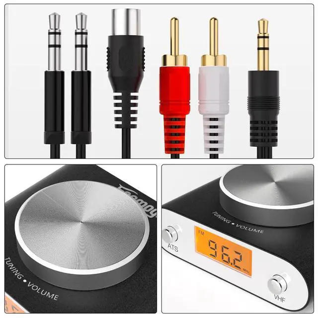 Long press the rotary button to enter the manual frequency tuning function, long press the ATS button to enter the automatic station search function, long press the VHF to select the country frequency (three groups of frequencies, worldwide use), short press the VHF to store the station ^^ Minimalist Design-- FM radio receiver is compact and sturdy with an black alloy case. Although there are few buttons, we have integrated almost all the adjustment functions above the rotary knob, you can easily control all the functions with this one knob. Long press the knob to enter the manual FM function, and short press the knob to enter the volume function, rotate the knob to adjust the volume or the station without any complicated buttons ^^ Package Content-- 1 x FM radio receiver, 1 x USB -C cable, 1 x AV cable, 1 x 3.5 mm audio cable, 1 x 10m retractable antenna, 1 x user manual.