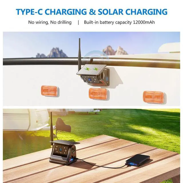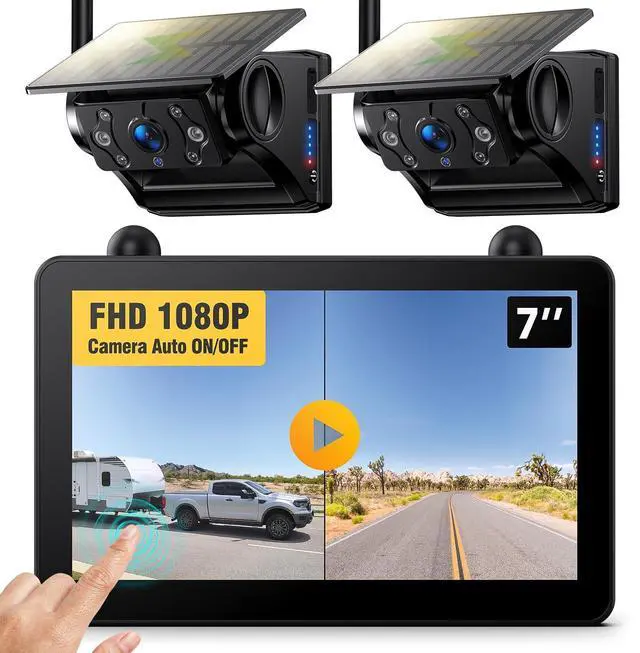 Image Sensor: The solar wireless magnetic camera features a 1080P HD color CMOS sensor & a 7 inch Touchscreen Full HD IPS monitor, delivering ultra-clear monitoring images. Equipped with 6 infrared night vision LED lights, it ensures visibility even in complete darkness to keep you safe. ^^ Stable Digital Signal & Loop Recording: The upgraded antenna ensures the digital signal remains strong and stable within 328ft (without obstacles). Ideal for long-distance travel and highway use, with no image freezing or signal loss! The monitor comes with a 32GB SD card and features loop recording and local playback, making it a perfect dash cam that allows easy access and viewing of videos directly on the monitor.