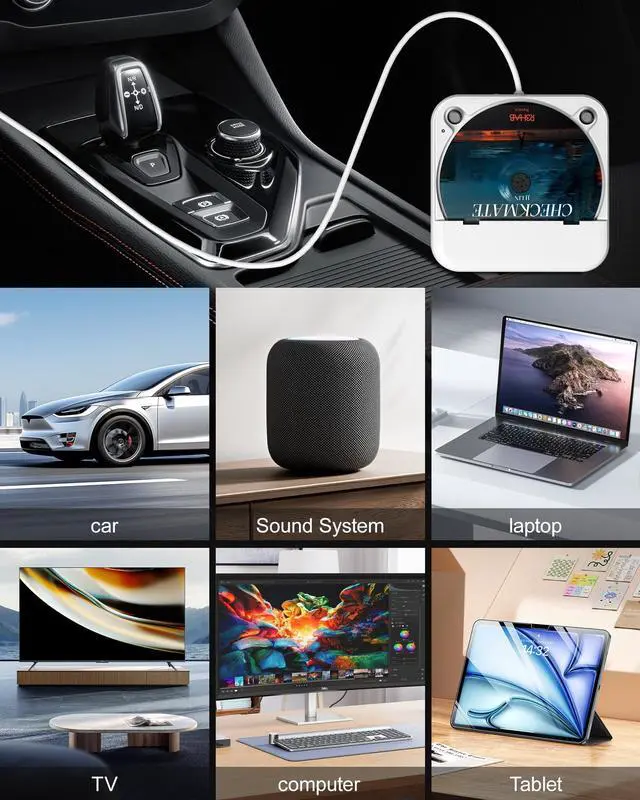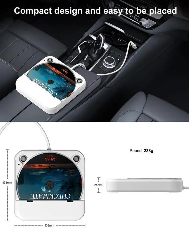 Car CD player: It easily connects to your car's USB, Sound System, laptop, TV, or computer, making it super convenient. Quality sound! Value for money! Perfect for all ages! ^^ Cool Little CD Player & No skipping: The built of the car cd player is no bigger than a CD and a few inches thick so it is easy to store. There is no lagging, skipping, it's very sturdy and heavy duty. ^^ USB &