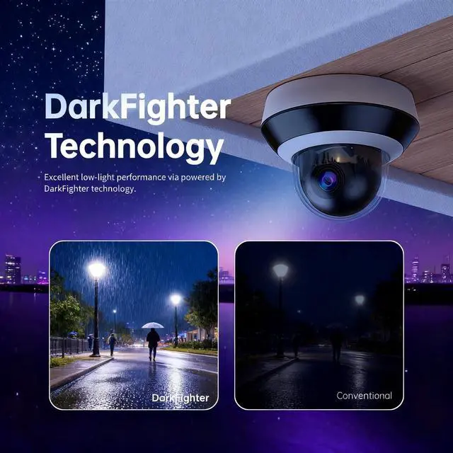 4MP Detail & Powerful Low-Light Performance See everything in crystal-clear 4MP resolution, day or night. Powered by DarkFighter technology, this PTZ camera captures vibrant, full-color video even in extremely low-light conditions, far surpassing standard night vision cameras.