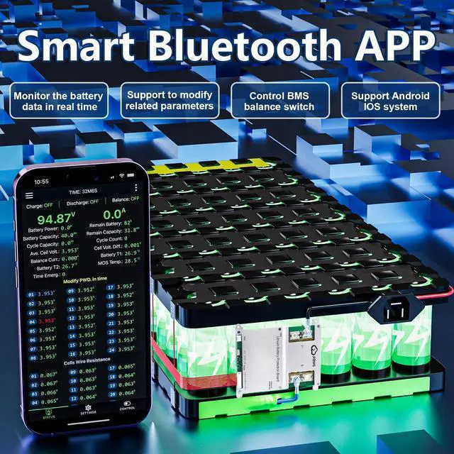Easy Connection: Effortlessly manage your battery with JK BMS mobile app for Android and iOS. Bluetooth connectivity allows you to monitor status, adjust settings, and control charging/discharging from your device ^^