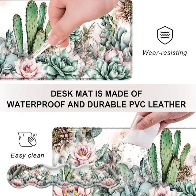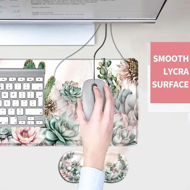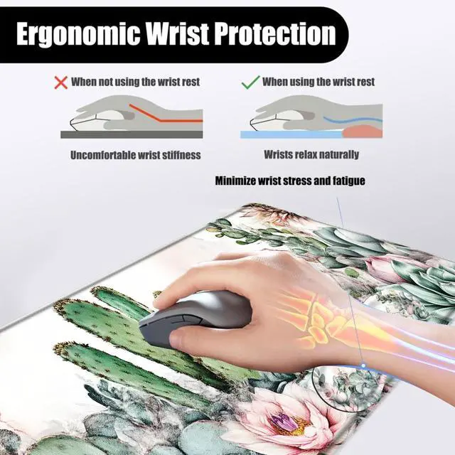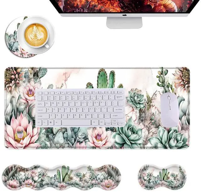 smauncucn Mouse Pad,Large Desk Mat Set, 4in1 XL Mousepad + Keyboard Wrist Rest+Mouse Wrist Rest+Coaster with Ergonomic Desk Pad for Home Office Table Computer Cover -Cacti Succulents with Flowers
