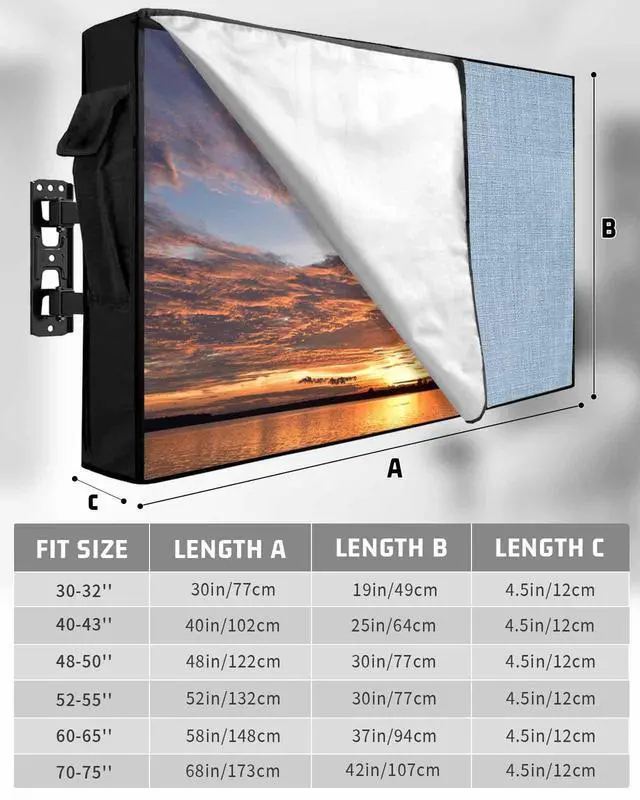 An Essential Item for Outside Television --- Weatherproof Outdoor TV CoversOur outdoor TV screen protector with hardcore protection and thoughtful design, becomes your exclusive bodyguard for outdoor TV, guarding the audio-visual feast 24/7TV Display Protectors Features- Selected 600D Oxford fabric, with excellent wear-proof, can easily block daily wind and sun exposure, as well as occasional tree branch scratches, effectively preventing fabric damage and ensuring long-term use. - The internal PVC coating not only keeps rain and snow out, but also resists humid air. Even in highly humid environments, it can keep the inside of the TV dry, eliminating the risk of malfunctions caused by dampness- Paired with a smooth zipper, it opens and closes smoothly without jamming, making it easy to tightly wrap the TV.