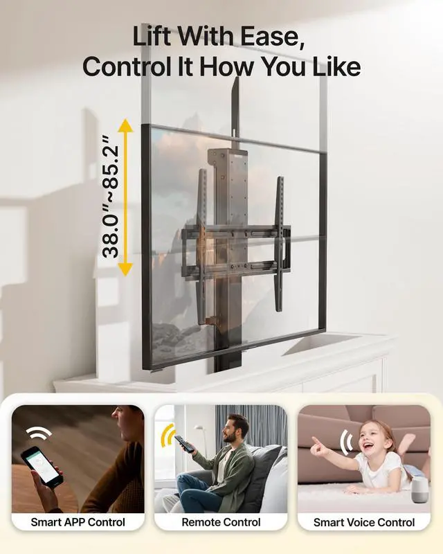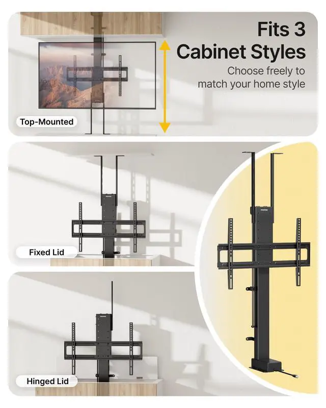 installation options: In ceiling cabinets, standard cabinets, wall cabinets and concrete or wooden surfaces. Our adaptable TV lift mechanism seamlessly integrates into any environment, providing ideal solutions for both home theaters and professional spaces. ^^ Electric Height Adjustment & Smooth Silent Operation: Achieve the perfect viewing angle every time. Our motorized tv mount allows you to seamlessly lower your TV to 98.0 inches or raise it to 85.2 inches. This innovative tv lift mechanism ensures an ergonomic experience for both seated and standing viewing, reducing neck strain. The ultra-quiet motorized tv lift ensures smooth, nearly silent operation without disturbing your immersion. ^^