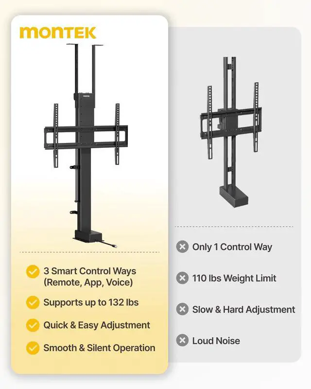 Sturdy Build & Wide Compatibility: Engineered with premium materials, our robust motorized tv mount mechanism securely holds TVs up to 132 lbs (4X load tested for enhanced safety). It accommodates 43 to 88 inch TVs with extensive VESA compatibility (200x200 to 600x400), ensuring perfect fit for most LED, LCD, OLED and QLED displays. This motorized tv lift delivers reliable performance for long-term use. ^^ RF Remote & Smartphone & Voice Control: Operate your tv lift with ultimate convenience. Use the included RF remote (no line-of-sight needed), the intuitive Tuya Smart App, or simple voice commands via Alexa or Google Home. Compared to other competing products that only offer remote control adjustment, this motorized tv mount is integration with the smart home system enables you to command the motorized tv lift hands-free. It is highly suitable for modern smart home environments. ^^