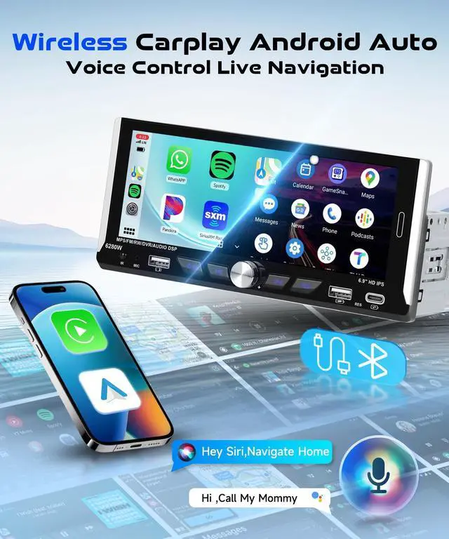 [Android Auto]: Sync your Android phone via USB to navigate, play media, and manage tasks hands-free. ^^ 6.9 inch