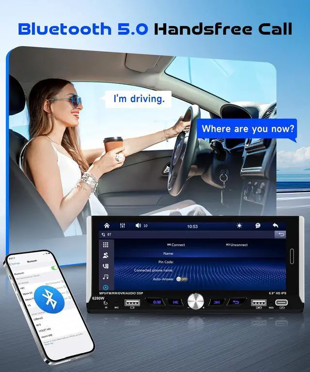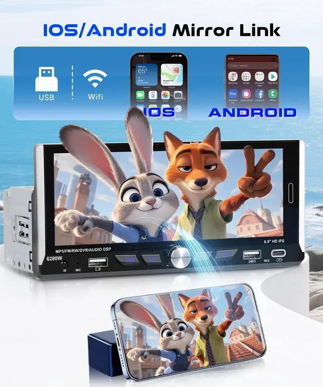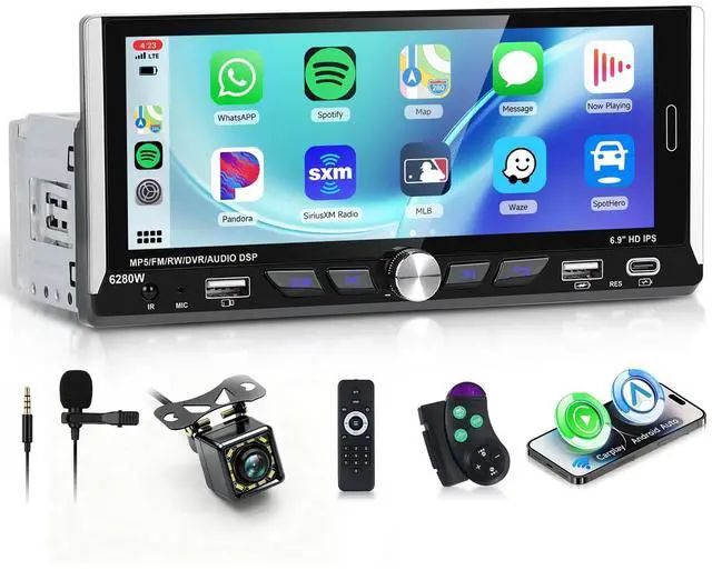 Single Din Head Unit: 6.9" HD 2.5D IPS Touchscreen (1280x480 resolution) and a dynamic menu interface. The single din radios responsive touchscreen makes every swipe smooth and intuitive. 7 Colorful Backlighting give you colorful button chose to match your cars vibe. ^^ Mirror Link &