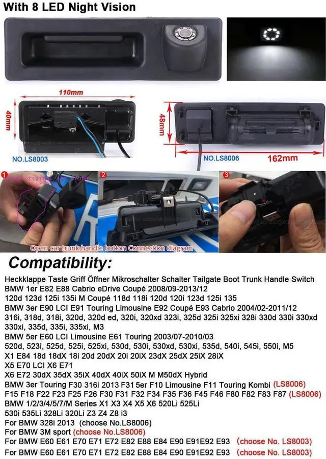 LS8006); Compatible with BMW 3M sport (choose N0. LS8006); Compatible with BMW E60 E61 E70 E71 E72 E82 E88 E84 E90 E91E92 E93 (choose No. LS8003)Since the same car model may differ in different countries, please check the camera size and carefully compare the installation of your car to avoid mistakes.