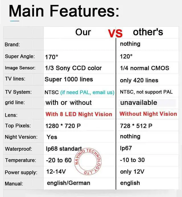 Package contents: 1 x reversing camera1 x power cable (1m) 1 x AV cable (6 m) 1 x user manual