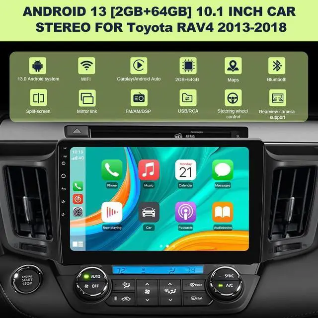Toyota RAV4 2013-2018: Equipped with the latest Android 13 operating system that guarantees maximum security, customization, and compatibility with over 3 million apps on Google Play. The combination of 2G 64GB allows you to run multiple apps simultaneously without lag.