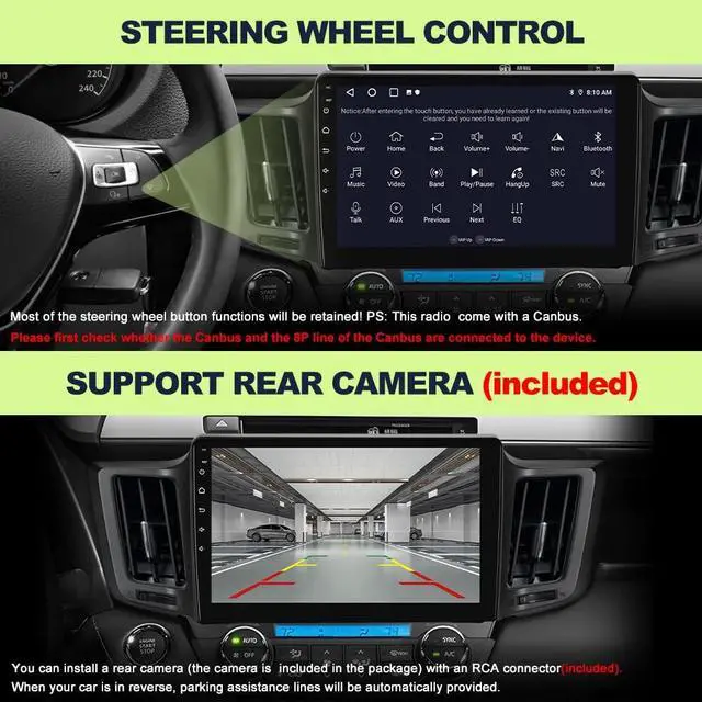 ^^ Reverse Assist: Connect an AHD720P/CVBS rear camera (included) via the RCA port. When reversing, guidance lines will be displayed on the screen. Compatible with original reversing radars (modified radars are not supported).