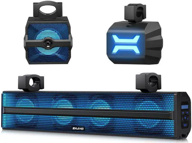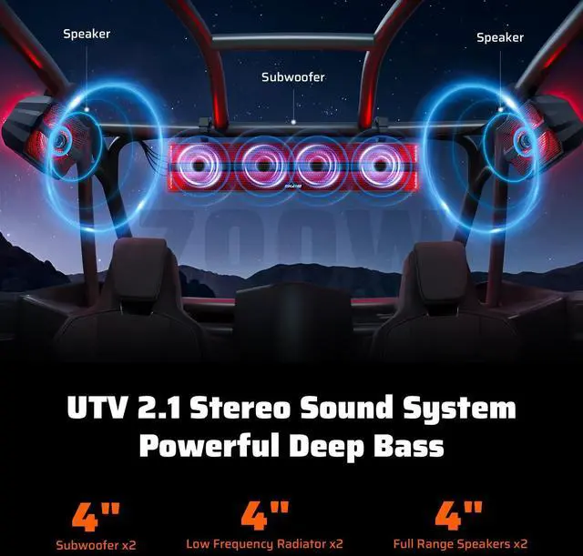Powerful 2.1 Stereo SoundEhaho 2.1 channel sound system comes with 2x 4" full-range speakers and 26-inch rectangular subwoofers which gives you a peak power of 700W. The Ehanced subwoofer with 2x 4" speaker unit delivers a deeper, and two full-range diaphragms, richer bass sound. Even in intense off-road adventures, experience powerful and immersive surround sound for a realistic music experience ^^ Dynamic RGB LightingThe subwoofer has additional RGB LED lights on the center and sides, creating a cool and stunning effect as the lights reflect onto the vibrating utv speakers. The two full-range speakers come with blue LED lights that change in brightness with the volume, adding a dynamic and stylish visual element.
