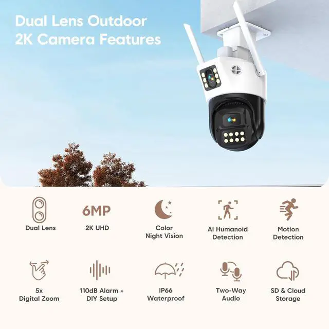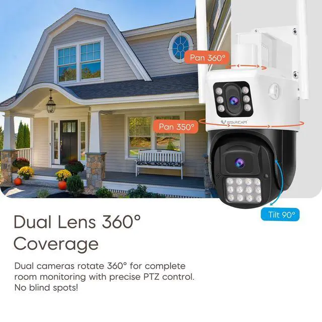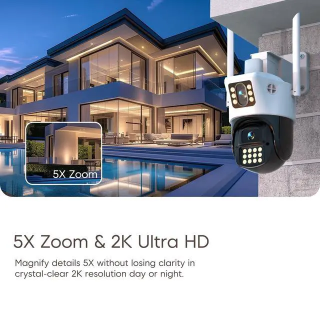 PTZ Control & Complete Coverage: Dual lenses provide wider coverage! Remotely pan/tilt/zoom this outdoor wireless security camera via app for true 360 monitoring. Eliminate blind spots across driveways, yards, or large properties effortlessly. ^^ 5X Digital Zoom & 2K