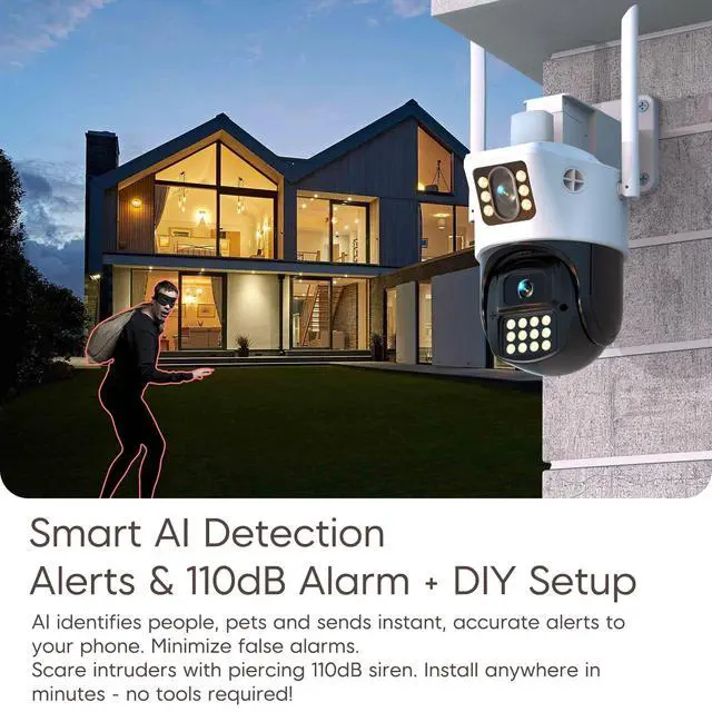 Clarity: See critical details up close! This wireless outdoor cameras for home security features 5X digital zoom with 2K HD resolution. Clearly identify faces, license plates, or packages at a distance day or night. ^^ Smart AI Detection & Precise Alerts: Advanced detection distinguishes people, vehicles, and pets. This wifi security camera outdoor wireless sends relevant phone alerts, reducing false alarms. Focus only on important security events around your home. ^^ 110dB DIY PIR Alarm & Simple Setup: Customize motion-triggered 110dB siren sensitivity via app! Scare off intruders instantly. This wireless outdoor cameras for home security offers tool-free installation and connects via 2.4GH z ^^ Advanced Full